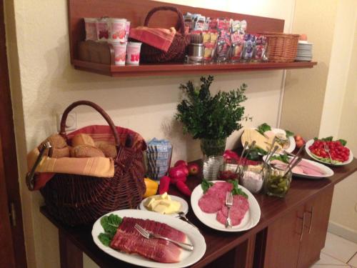 Kranichs morgenbuffet omfatter forskelligt kødpålæg samt friskbrygget te og kaffe. Der laves madpakker efter anmodning.