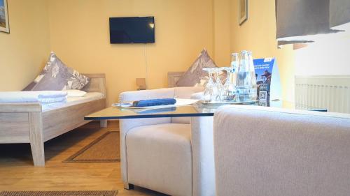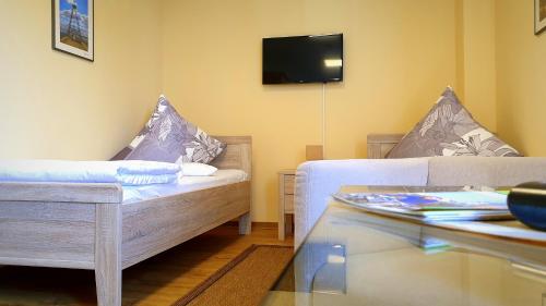 Haus Vier ligger i Großräschen, 10 km fra Lausitzring, og har en have, et fælles opholdsområde og en terrasse samt gratis privat parkering. Her er restaurant, roomservice og en udflugtsskranke samt gratis wi-fi overalt. Der er en bar.