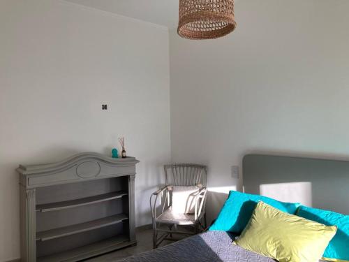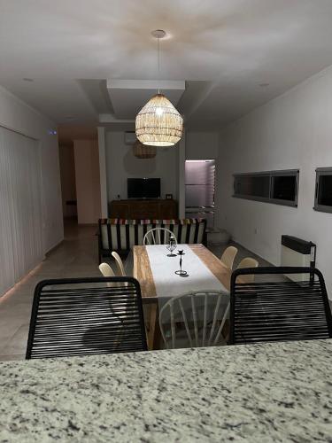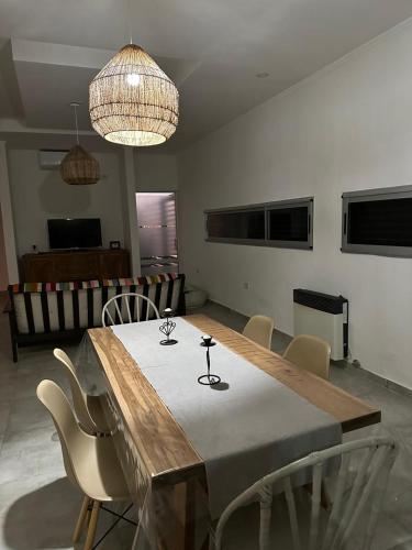 Dieses Ferienhaus mit Klimaanlage und 1 Schlafzimmer verfügt über einen Essbereich, Flachbild-TV und eine Küche mit einem Kühlschrank.
