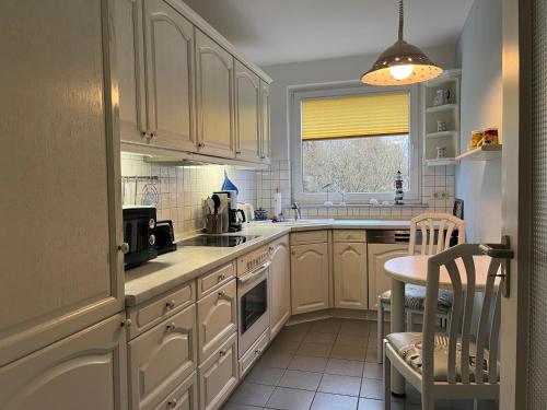 Diese Ferienwohnung ist versehen mit einem Flachbild-TV. Die Küchenzeile ist ausgestattet mit einem Kühlschrank und einem Geschirrspüler, einem Ofen sowie einer Kaffeemaschine und einem Wasserkocher.