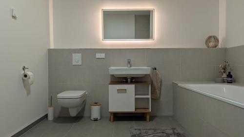 Neue moderne große Wohnung am See mit Terrasse, Garten, WLan, Einbauküche, Badewanne, nähe Berlin