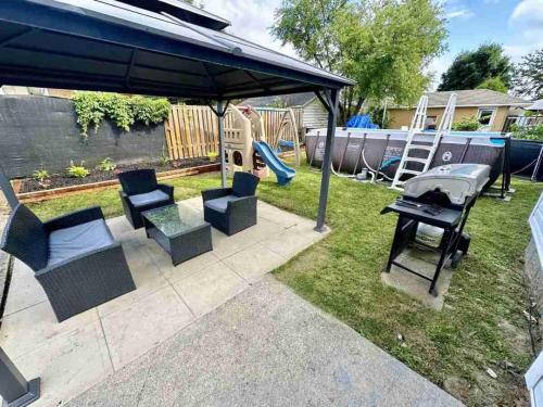 Gäste können in der Unterkunft Hamilton Chic Retreat - Comfy Beds - Garden - Pool eine Sonnenterrasse und einen Kinderspielplatz nutzen.