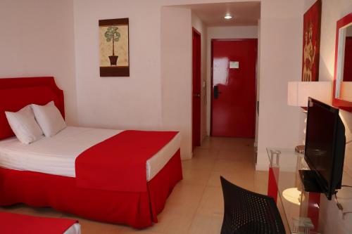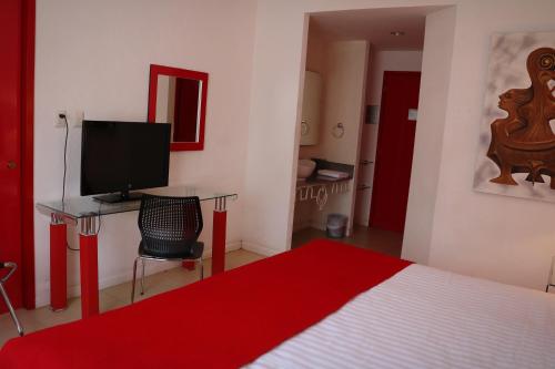 Die in Rot und Weiß gehaltenen, klimatisierten Zimmer verfügen über Fliesenböden, einen Flachbild-TV und einen Schreibtisch. Das eigene Bad ist mit einer Dusche ausgestattet.