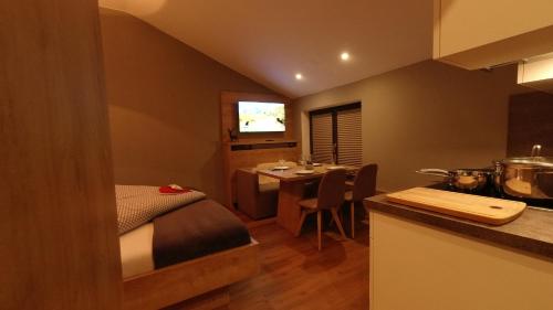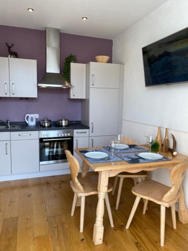 Eine voll ausgestattete Küche mit einem Kühlschrank und einer Kaffeemaschine ist vorhanden.