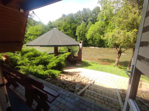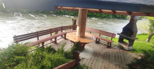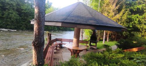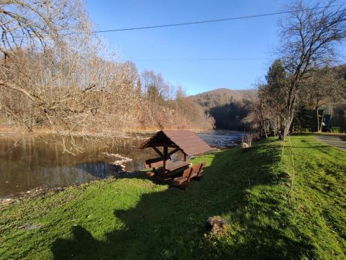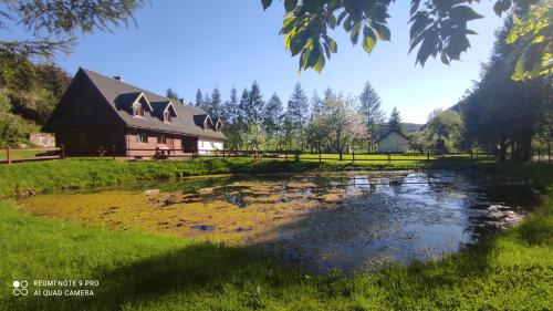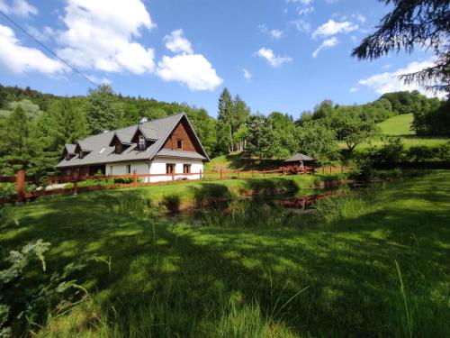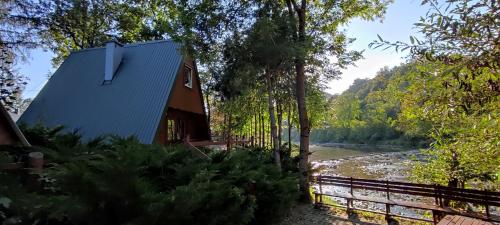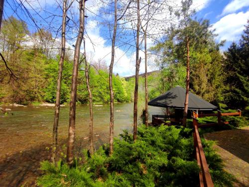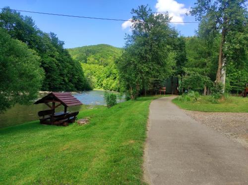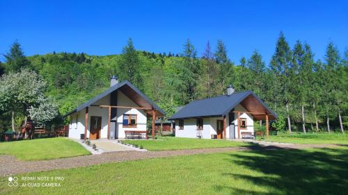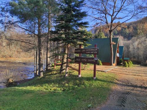 Die Unterkunft Domki "Nad Rzeką Solinką" Tomasz Pasławski mit Bergblick in Polańczyk bietet Übernachtungsmöglichkeiten mit einem Garten, einer Terrasse und Grillmöglichkeiten.