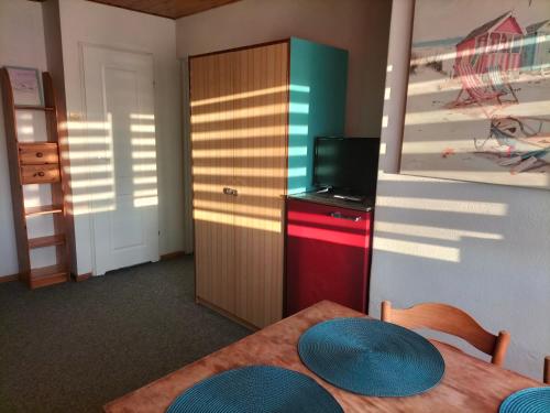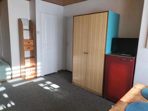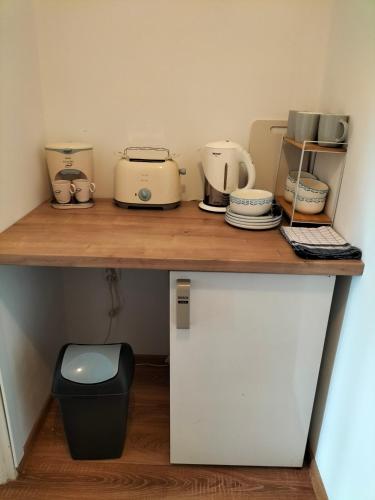 Es gibt einen Kühlschrank sowie einen Wasserkocher.