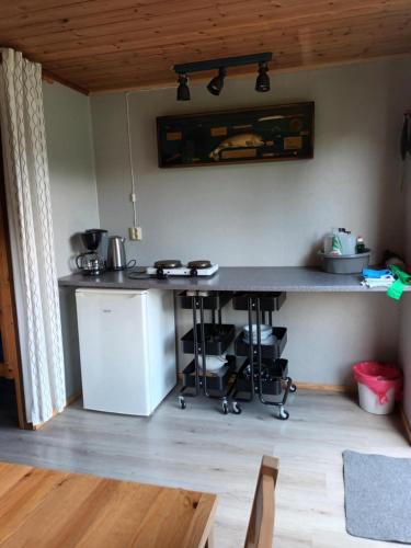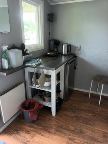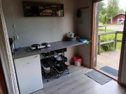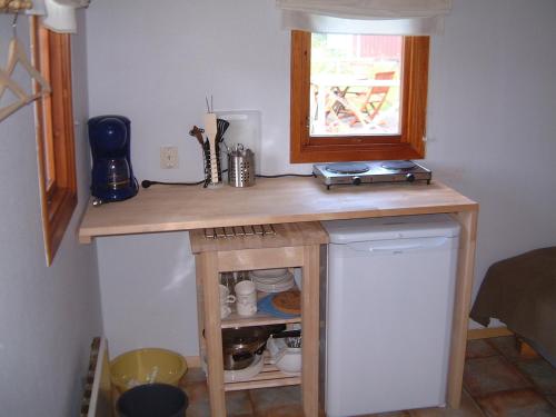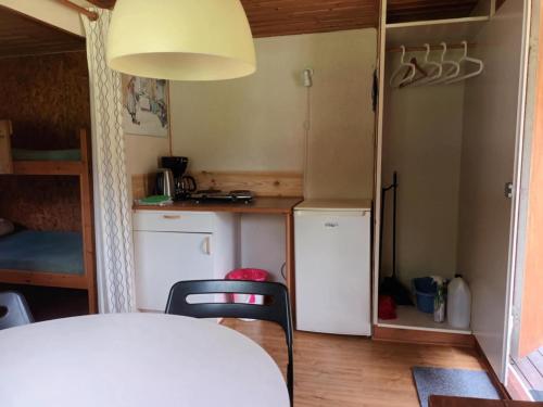 Es gibt auch einen Essbereich und eine Küchenzeile ausgestattet mit einem Kühlschrank und einer Herdplatte.