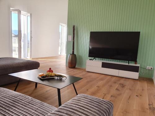 Diese Ferienwohnung mit einer Terrasse und Bergblick hat 2 Schlafzimmer, ein Wohnzimmer, einen Flachbild-TV, eine gut ausgestattete Küche mit einem Kühlschrank und einem Geschirrspüler sowie 1 Badezimmer mit einer Badewanne. In dieser Ferienwohnung werden Handtücher und Bettwäsche zur Verfügung gestellt.