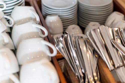 • Alle Teller, Bestecke, Gläser und anderes Geschirr wurden desinfiziert