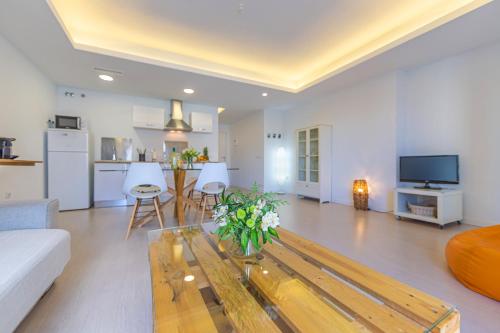 Diese Ferienwohnung mit einer Terrasse und Meerblick bietet 1 Schlafzimmer, ein Wohnzimmer, einen Flachbild-TV, eine gut ausgestattete Küche mit einem Kühlschrank und einer Mikrowelle sowie 1 Badezimmer mit einer Dusche. In dieser Ferienwohnung werden Handtücher und Bettwäsche angeboten.