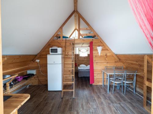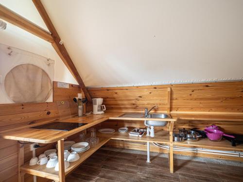 Es gibt einen Kühlschrank, eine Mikrowelle und eine Herdplatte sowie auch eine Kaffeemaschine in der Küche.