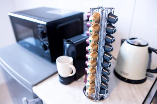 Este apartamento consta de 1 dormitorio, una sala de estar, una cocina totalmente equipada con nevera y cafetera, y 1 baño con ducha y artículos de aseo gratuitos. Hay toallas y ropa de cama en el apartamento.
