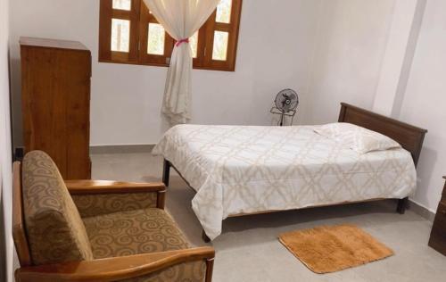 La habitación en casa particular incluye una cocina con nevera y microondas, además de cafetera. Hay toallas y ropa de cama en la habitación en casa particular.