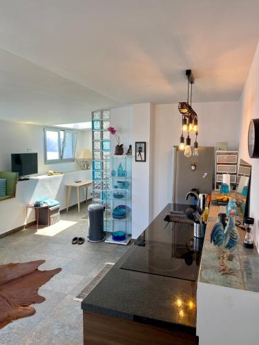 El apartamento cuenta con terraza y vistas al mar, y dispone de 1 dormitorio, una sala de estar, TV de pantalla plana, una cocina equipada con nevera y lavavajillas, y 1 baño con ducha. Hay toallas y ropa de cama en el apartamento.