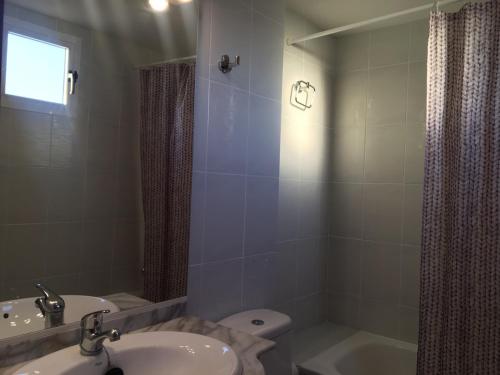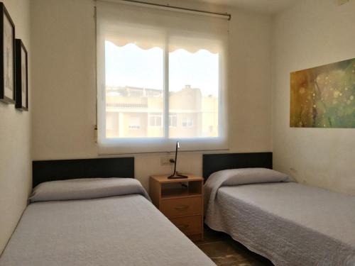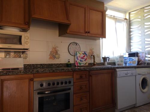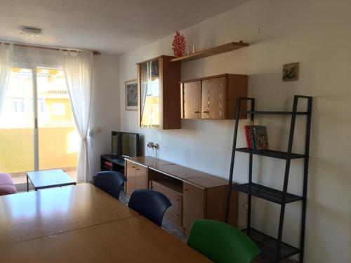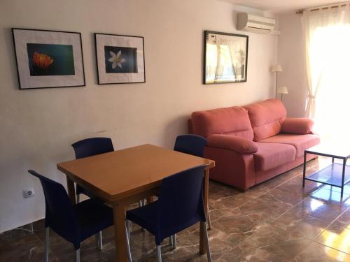 Xaloc Solo Familias Serviplaya ofrece balcón, zona de estar, TV, cocina totalmente equipada con nevera y horno, y baño privado con bañera. También hay microondas y cafetera.