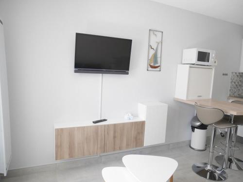 El apartamento incluye una zona de cocina con nevera y microondas, además de cafetera. Hay TV.