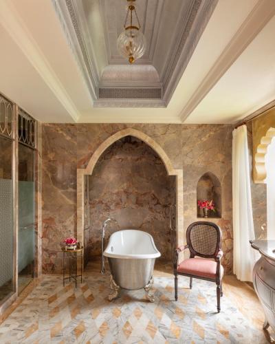 El hotel ofrece habitaciones con aire acondicionado, escritorio, cafetera, nevera, minibar, caja fuerte, TV de pantalla plana y baño privado con ducha. Cada habitación tiene hervidor, algunas ofrecen balcón y otras también disponen de vistas a la montaña. En Raffles Jaipur, todas las habitaciones disponen de ropa de cama y toallas.