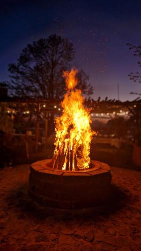 For guests with children, the chalet features outdoor play equipment. Guests can also warm themselves near outdoor fireplace after a day of fishing.