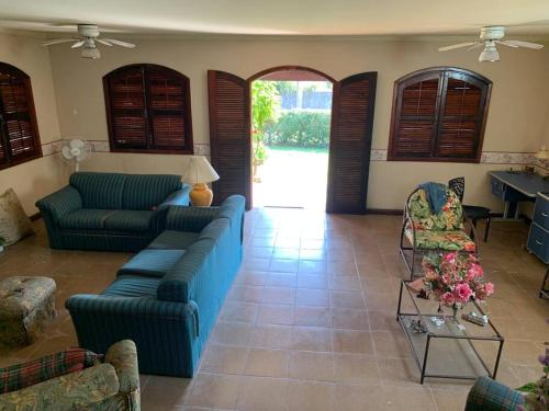The spacious holiday home features 5 bedrooms, 4 bathrooms, bed linen, towels, a flat-screen TV with streaming services, a dining area, a fully equipped kitchen, and a terrace with pool views. Guests can enjoy a meal on an outdoor dining area while overlooking the inner courtyard views. For added privacy, the accommodation has a private entrance and is protected by full-day security.