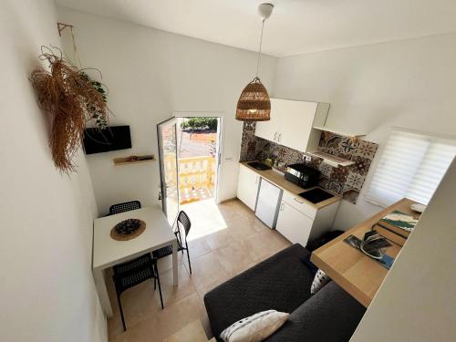 The apartment with a terrace and sea views features 1 bedroom, a living room, a flat-screen TV, an equipped kitchenette with a microwave and a fridge, and 1 bathroom with a walk-in shower. Towels and bed linen are provided in the apartment. The property has an outdoor dining area.