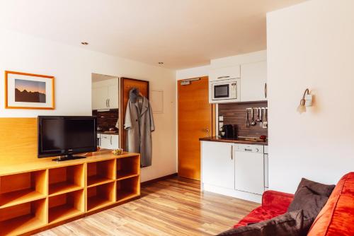 The apartment provides guests with a balcony, mountain views, a seating area, satellite flat-screen TV, a fully equipped kitchen with a dishwasher and an oven, and a private bathroom with walk-in shower and a hair dryer. A microwave, a toaster and fridge are also offered, as well as a coffee machine and a kettle. At the apartment complex, units are equipped with bed linen and towels.