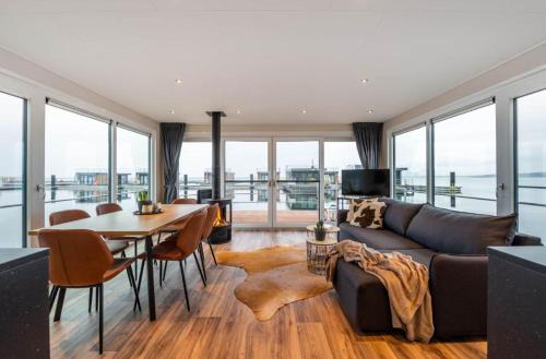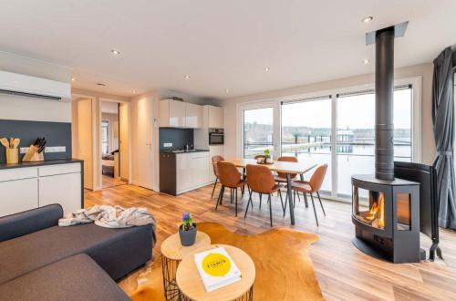 The boat with a terrace and lake views has 2 bedrooms, a living room, a flat-screen TV, an equipped kitchenette with a dishwasher and an oven, and 1 bathroom with a shower. Towels and bed linen are available in the boat. There is also a seating area and a fireplace.