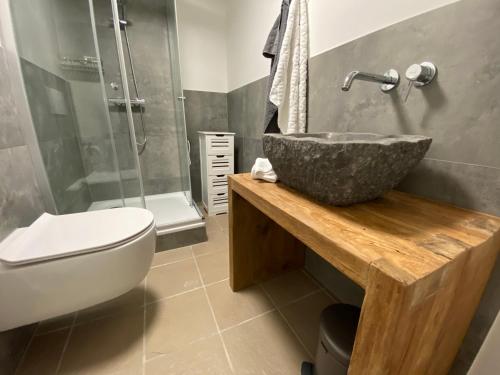 The apartment has 1 bedroom, a flat-screen TV with streaming services, a fully equipped kitchen with a microwave and a toaster, and 1 bathroom with a shower. A private entrance leads guests into the apartment, where they can enjoy some wine or champagne and chocolates or cookies.