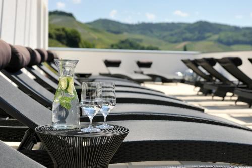 Hotel Ritter Durbach’s 1200 m² spa area features indoor and outdoor areas, including a rooftop spa with views of the Durbach Vineyards. It includes a fitness room, relaxation rooms with a library and fireplace, various saunas including a Finnish sauna, a bio sauna, a Rhassoul spa as well as an indoor pool, and a hot tub on a separate floor.