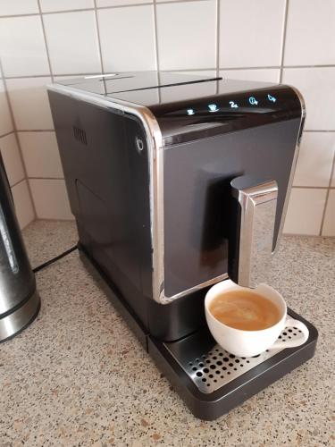 Un réfrigérateur, un lave-vaisselle et un four sont également disponibles dans la cuisine, de même qu’une machine à café.