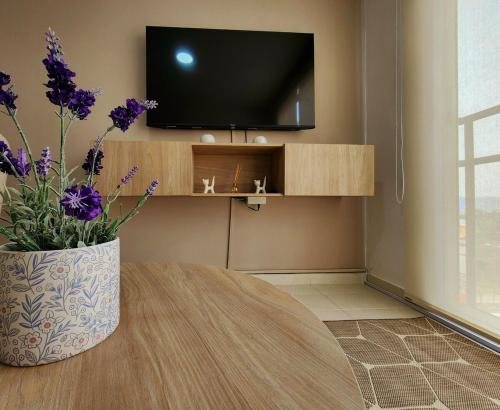 The apartment is composed of 1 bedroom, a fully equipped kitchen, and 2 bathrooms. A flat-screen TV is featured.