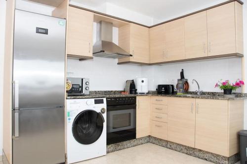 Dans cet appartement, vous trouverez 2 chambres, un salon, ainsi qu’une cuisine entièrement équipée avec un réfrigérateur et un four.