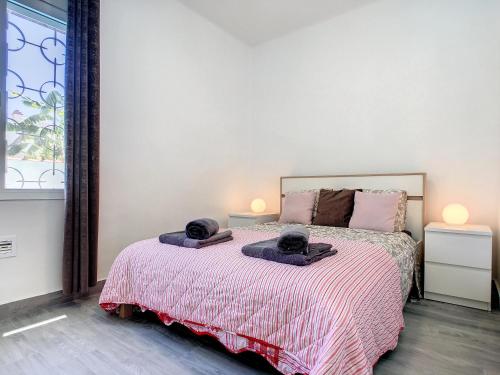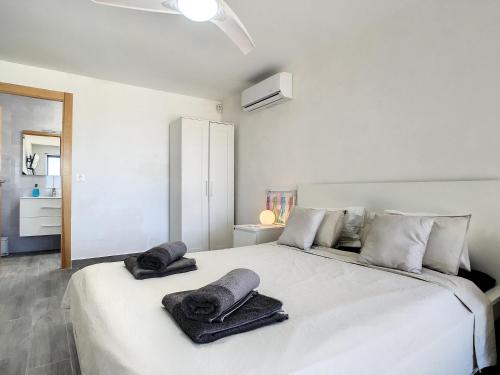 Cette villa avec climatisation se compose de 4 chambres, d'un salon, d'une cuisine entièrement équipée avec un réfrigérateur et une machine à café, ainsi que de 2 salles de bains avec une douche et un sèche-cheveux. Des serviettes et du linge de lit sont à disposition.