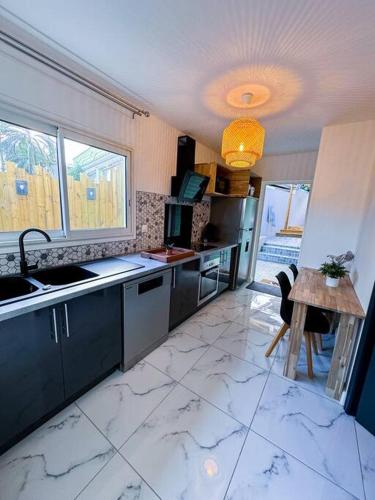 Cette villa avec climatisation se compose de 2 chambres, d'un salon, d'une cuisine entièrement équipée avec un réfrigérateur et une machine à café, ainsi que de 1 salle de bains avec une douche et un bain à remous. Des serviettes et du linge de lit sont à disposition.