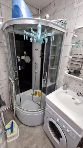 Cet appartement comporte 1 chambre, une cuisine avec un réfrigérateur et un micro-ondes, ainsi que 1 salle de bains avec une douche, un sèche-cheveux et un lave-linge.