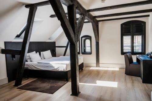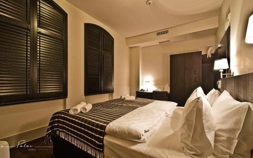 Each air-conditioned room at the palace offers unique interiors with visible wooden beams and modern furniture. The bathroom done in beige and black features a glass shower cabin.