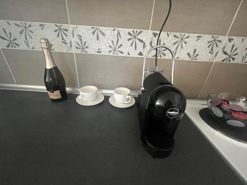 Cet appartement avec climatisation comporte 1 chambre, un coin salon, une télévision à écran plat et une cuisine avec un four.