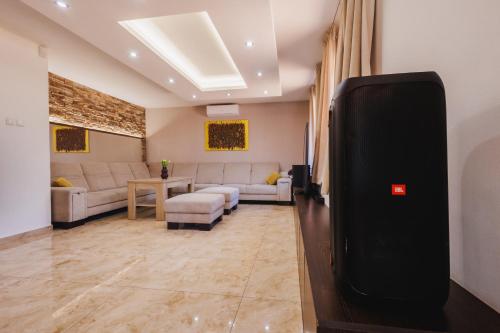Cette villa avec climatisation se compose de 8 chambres, d'un salon, d'une cuisine entièrement équipée avec un réfrigérateur et une machine à café, ainsi que de 3 salles de bains avec un bidet et une douche. Des serviettes et du linge de lit sont à disposition.