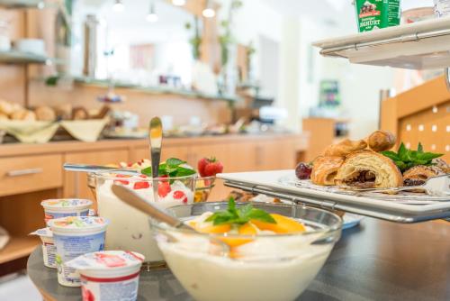 A full breakfast buffet is served each morning in Beim Schrey’s modern breakfast room. The buffet includes a selection of meats and cheeses, fresh fruits and yoghurts.