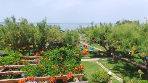 Younger guests can enjoy safe play at the playground. The garden features seating areas for relaxation.