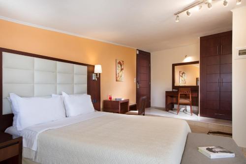 Guests can relax at the sun loungers by the pool and enjoy a refreshing drink from the poolside bar, while younger guests can spend their time at the children's pool. Greek flavours can be enjoyed at the restaurant for lunch or dinner.