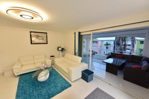 The spacious apartment features 2 bedrooms, 2 bathrooms, bed linen, towels, a flat-screen TV with streaming services, a dining area, a fully equipped kitchen, and a terrace with sea views. Guests can enjoy a meal on an outdoor dining area while overlooking the pool views. The property offers garden views.