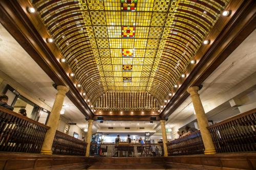 The lobby features antique furnished sitting areas, as well as stained glass ceilings and a cherry wood staircase. A gift shop is available.