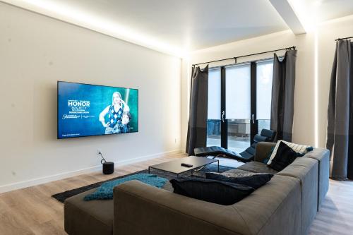 The apartment is composed of 1 bedroom, a fully equipped kitchenette, and 1 bathroom. A flat-screen TV is featured.