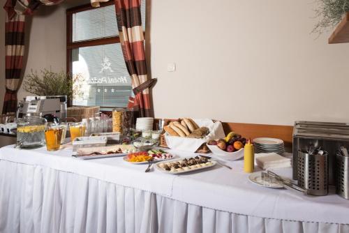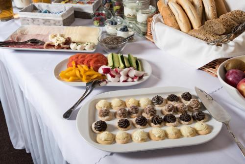 A selection of options including fresh pastries, fruits and cheese is served for the continental breakfast.