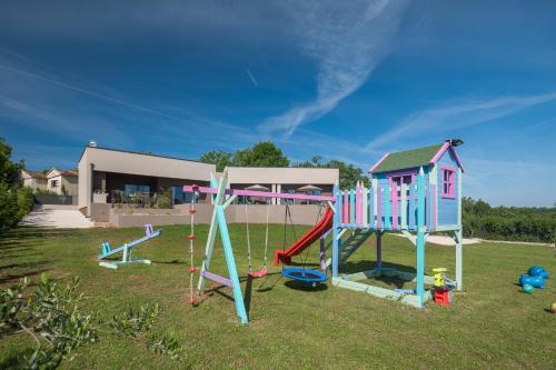 For guests with children, the villa offers outdoor play equipment and a baby safety gate.