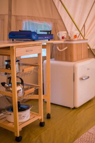 There is also a kitchen in some of the units equipped with a fridge, a dishwasher, and a stovetop.