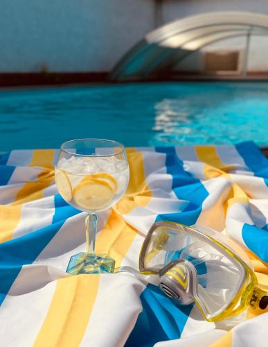 The holiday home features an outdoor fireplace and a seasonal outdoor pool.