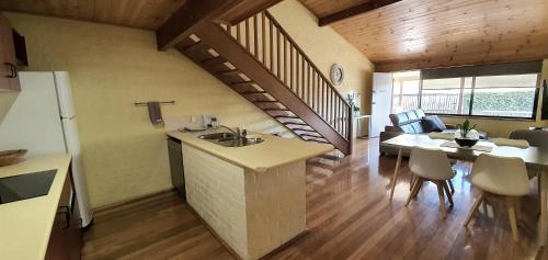 Each split-level apartment has a fully equipped kitchen, a dining setting.