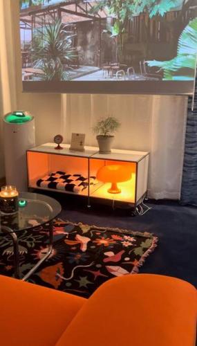 Questo appartamento con aria condizionata ha 1 camera da letto, TV a schermo piatto, zona pranzo e cucina con frigorifero e soggiorno.