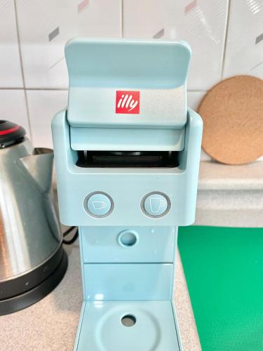 L'angolo cottura presenta frigorifero, microonde e piano cottura, e l’alloggio dispone di bidet, asciugacapelli e pantofole.